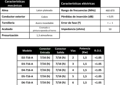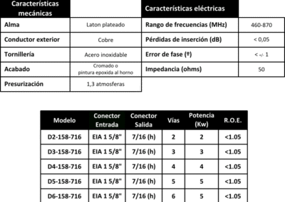Distribuidor de potencia simétrico de 2 salidas. Banda IV-V. Conector de entrada EIA 1 5/8″ y salidas 7/16 hembra. ROE 1.05.