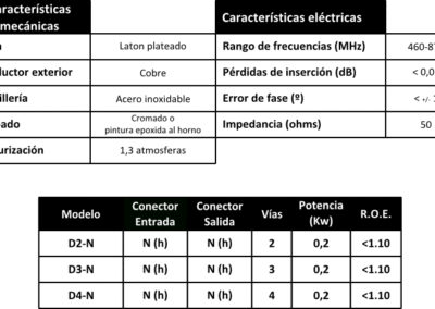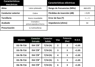 Distribuidor de potencia simétrico de 2 salidas. Banda IV-V. Conector de entrada EIA 7/8″ y salidas 7/16 hembra. ROE 1.05.