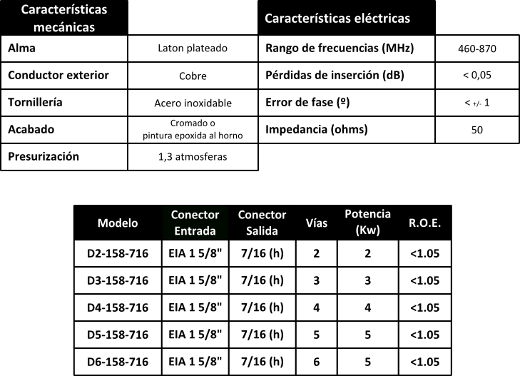 Distribuidor de potencia simétrico de 2 salidas. Banda IV-V. Conector de entrada EIA 1 5/8″ y salidas 7/16 hembra. ROE 1.05.