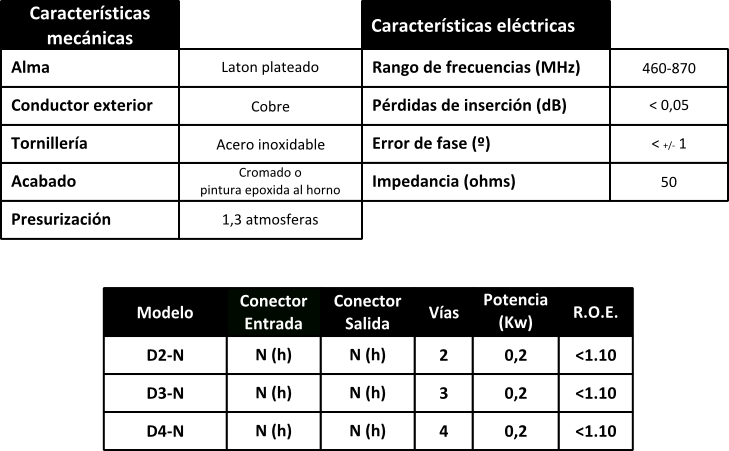 Distribuidor de potencia simétrico de 2 salidas. Banda IV-V. Conector de entrada y salida EIA 7/8″. ROE 1.05.